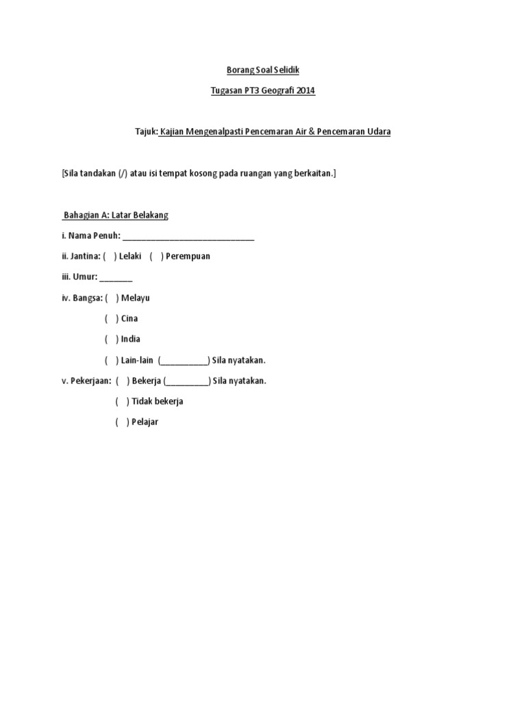 Contoh borang soal selidik geografi pt3 2018. Kajian kes kegiatan ekonomi penduduk di felda jengka pahang. Ada beberapa contoh soalan soal selidik geografi pt3 201. Tajuk kajian 'guna tanah di kawasan kajian anda' telah dipilih sebagai tugasan yang wajib disiapkan oleh setiap calon pt3 pada tahun 2018. Kegiatan ekonomi di (masukkan tempat kajian anda). Savesave contoh borang soal selidik geografi tingkatan 2 for later. Hbhe3203 kebersihan da keselamatan persekitaran via www.slideshare.net. Selamat maju jaya kepada semua calon pt3 2016 usaha tangga kejayaan :d. Panduan buat calon pt3 yang sedang membuat satu tugasan kerja kursus geografi pt3 tahun 2018. Borang soal selidik atau temubual merupakan satu borang yang disediakan dengan pengisian beberapa soalan serta ruangan untuk responden menjawab soalan dan permaslahan yang ditanya. 73% 73% found this document useful, soal selidik. Contoh borang soal selidik tugasan pt3 geografi. Contoh pencemaran alam sekitar pada masa kini ialah 2.