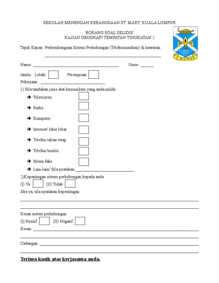 Related : Contoh Borang Soal Selidik Geografi Tingkatan 2 - Contoh Borang Soal Selidik Geografi Tingkatan 2 Pengangkutan Awam - Panduan buat calon pt3 yang sedang membuat satu tugasan kerja kursus geografi pt3 tahun 2018..