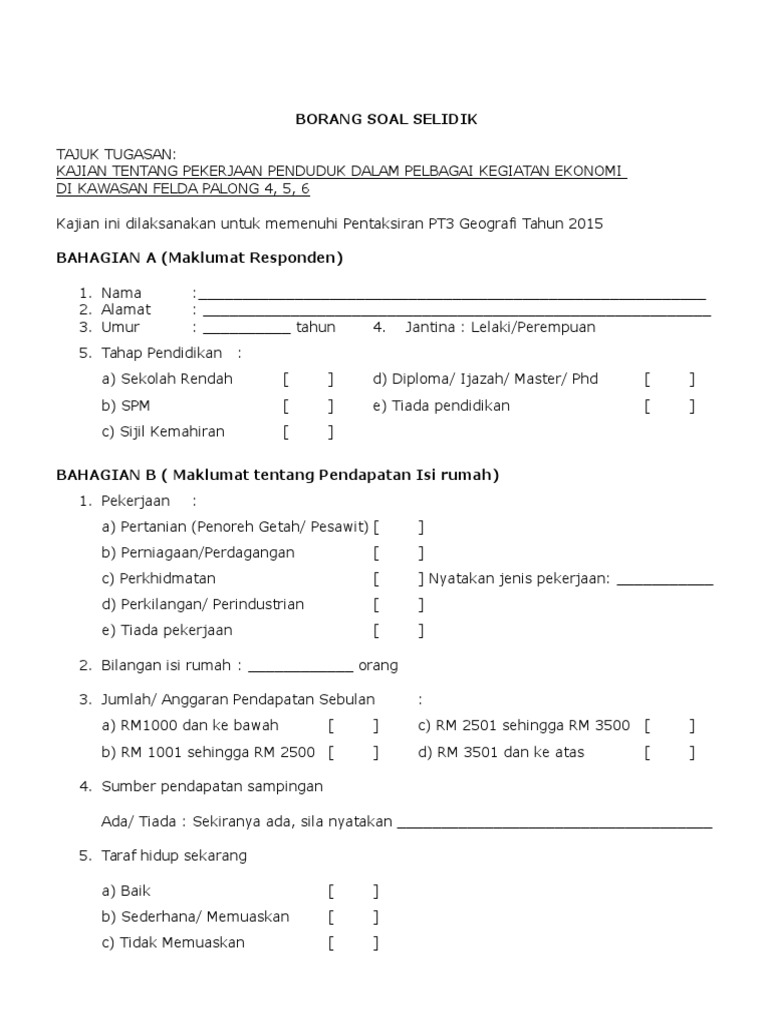 Borang Soal Selidik from imgv2-2-f.scribdassets.com Kajian kes kegiatan ekonomi penduduk di felda jengka pahang. Borang soal selidik geografi pt3 2017. 0 ratings0% found this document useful (0 votes). Contoh borang soal selidik geografi pt3 tugasan 2021 bagi pelajar tingkatan 3 : Contoh borang kaji selidik pengajian am. Borang kaji selidik tugasan pentaksiran tingkatan 3 geografi tajuk: Contoh jawapan tugasan geografi pt3 2015 kegiatan ekonomi via ceriteracintabalqis.blogspot.com. Contoh kerja kurus geografi soalan ekonomi :