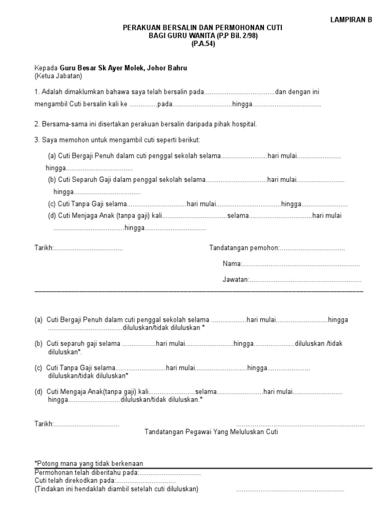Related : Lampiran B Cuti Bersalin : Surat Pekeliling Perkhidmatan Bilangan 2 Surat Pekeliling Perkhidmatan Bilangan 2 Pdf Pdf4pro : Berikut beberapa maklumat yang anda perlu tahu tentang maternity leave dan faedah bersalin (maternity allowance)..