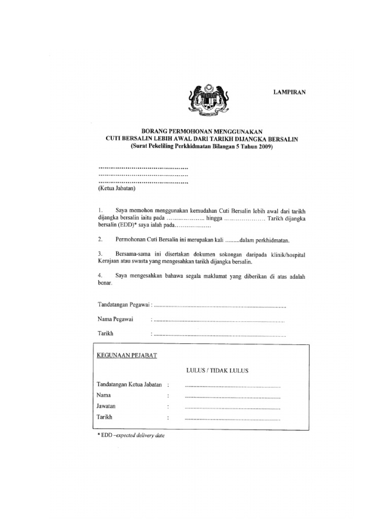 Borang permohonan cuti bersalin awal terkini pekeliling bilangan 2 tahun 1998 telah menetapkan kemudahan cuti bersalin kepada pegawai perkhidmatan awam adalah selama 60 hari yang moshims borang kemudahan cuti bersalin 2019.
